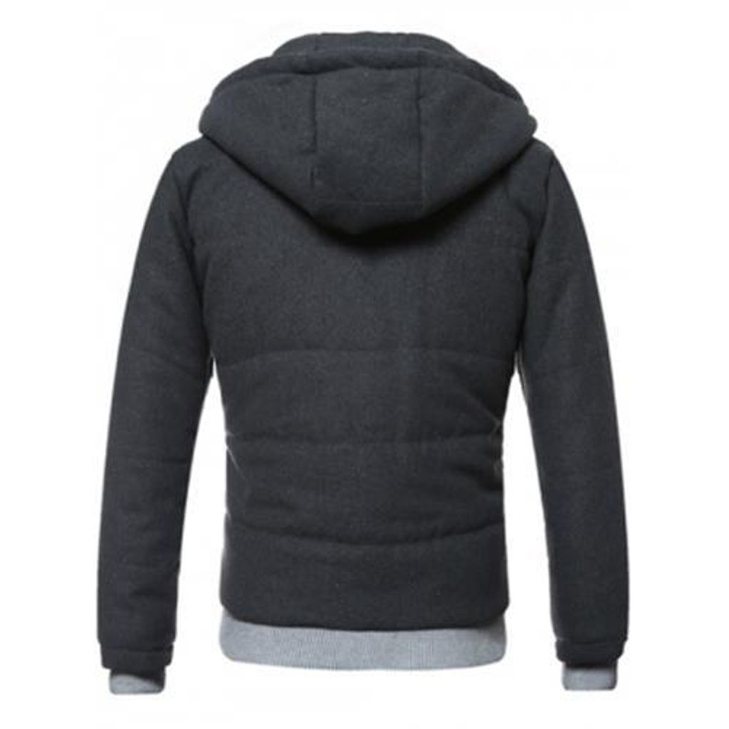 HOODED RIB SPLICING DESIGN ZIP-UP PADDED JACKET (BLACK)