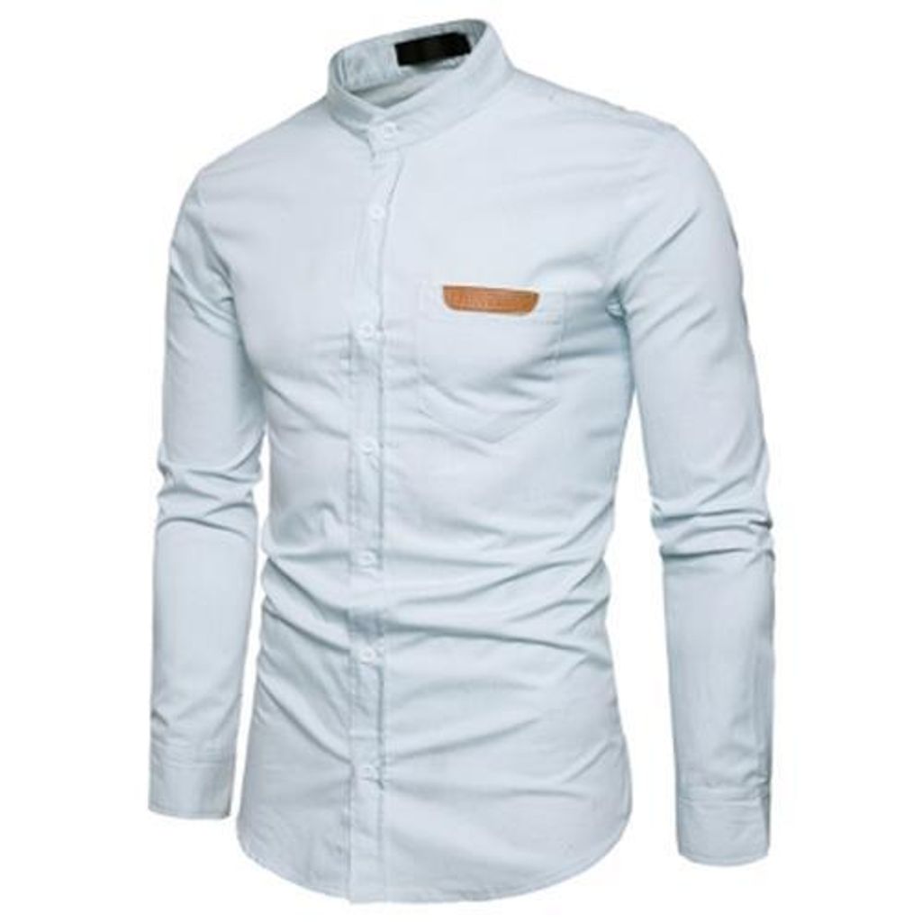 STAND COLLAR PU LEATHER EDGING CHAMBRAY SHIRT (WHITE)