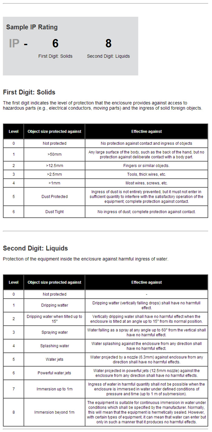 The IP Code (or International Protection Rating, sometimes also interpreted as Ingress Protection Rating*) consists of the letters IP followed by two digits and an optional letter. As defined in international standard IEC 60529, it classifies the degrees of protection provided against the intrusion of solid objects (including body parts like hands and fingers), dust, accidental contact, and water in electrical enclosures. The standard aims to provide users more detailed information than vague marketing terms such as waterproof.